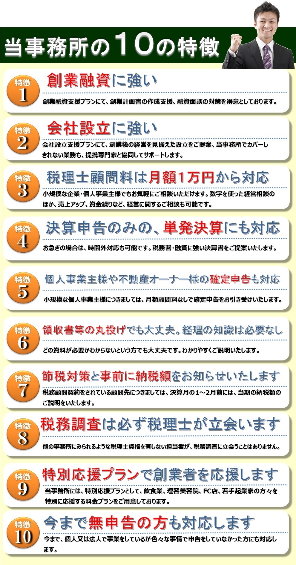 当事務所は、創業融資(日本政策金融公庫・制度融資)の支援を中心に、起業時のお悩み(開業支援、創業計画書作成、各種届出、経理、申告、節税など)を、税理士が親切・丁寧な対応で全力でサポートいたします。